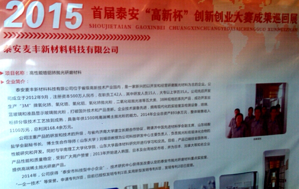 2015年10月30日上午,我公司參加首屆泰安“高新杯”創(chuàng)新創(chuàng)業(yè)大賽成果巡回展,為高新區(qū)及各駐泰高校展示大賽獲獎科技成果。我公司“高性能鋯鋁鈰拋光研磨材料”項目榮獲企業(yè)組三等獎。